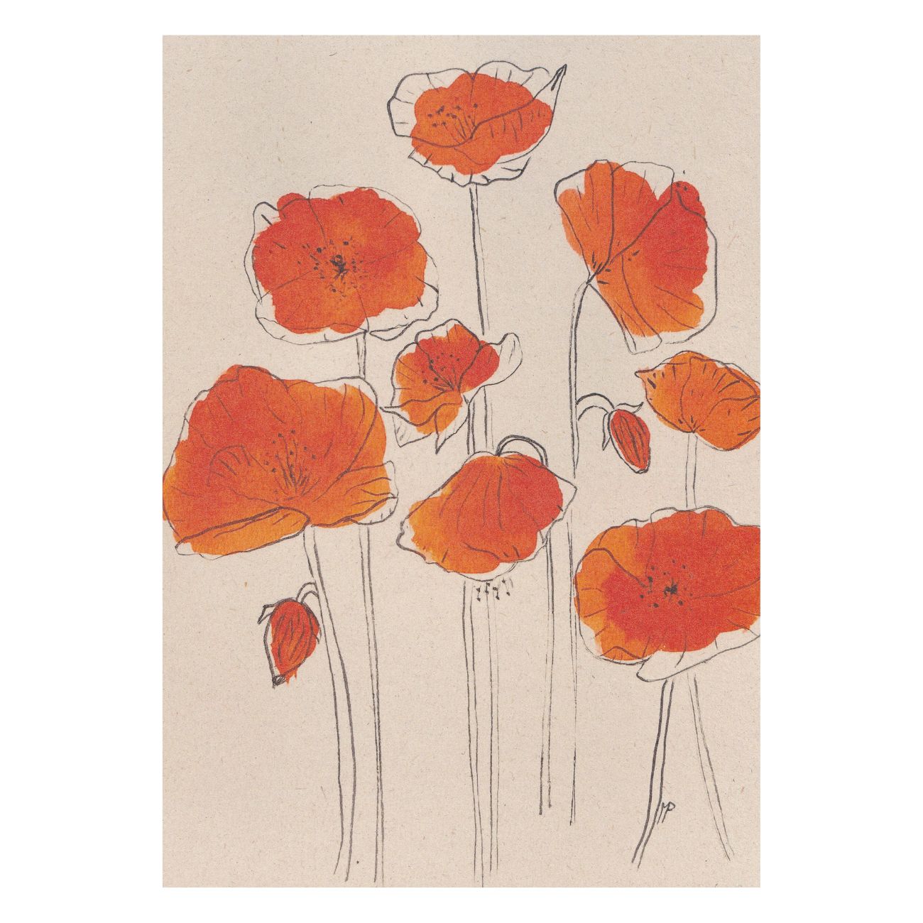Waar dit eerst alleen rode vlekken waren, ontstonden de klaprozen door de lijnen. Met als resultaat een ansichtkaart met een veld vol bloeiende rode klaprozen.